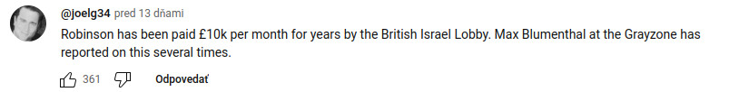 Keď si o ňom čítate, tak ľudia ho poznajú a poukazujú na jeho väzby na Izrael a nazývajú ho sionistom. Ale v roku 2024 je toľko hlúpych ľudí, že rozprávke o Robinsonovi uveria. Čo tam na tom, že krajná pravica bojovala aj proti Židom, tu vodca krajnej pravice je milovník Izraela.